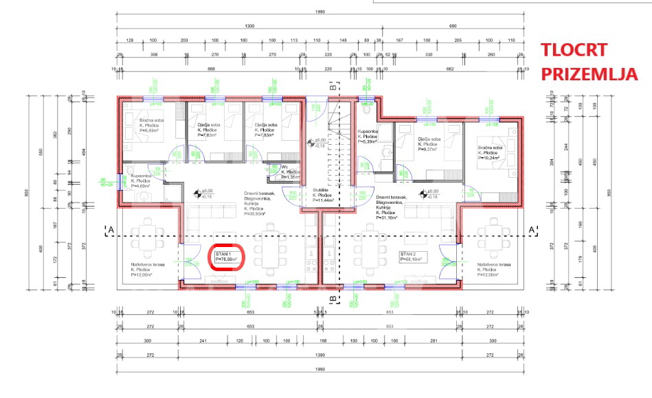 Stan S1 se nalazi u prizemlju s lijepo uređenom okućnicom od 70m2.Stanu pripadaju i 2 parkirna mjesta.